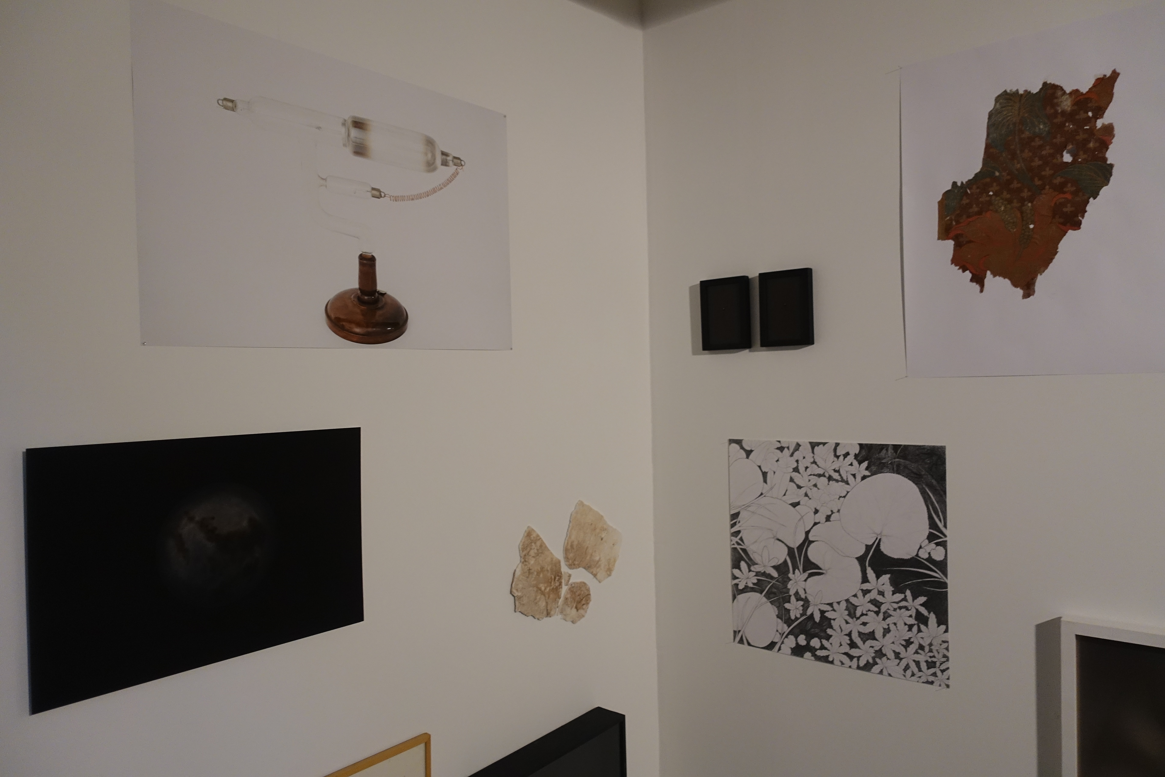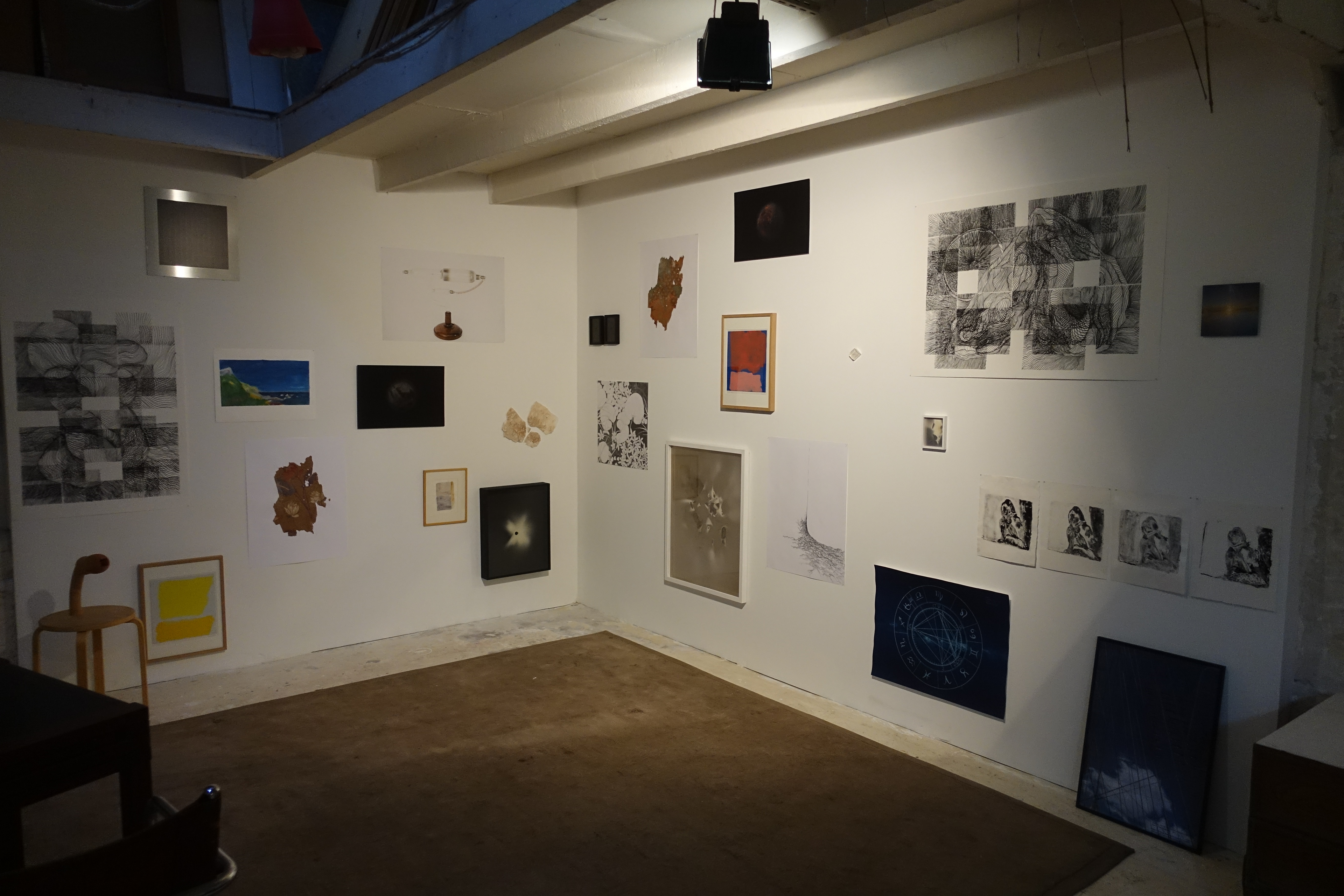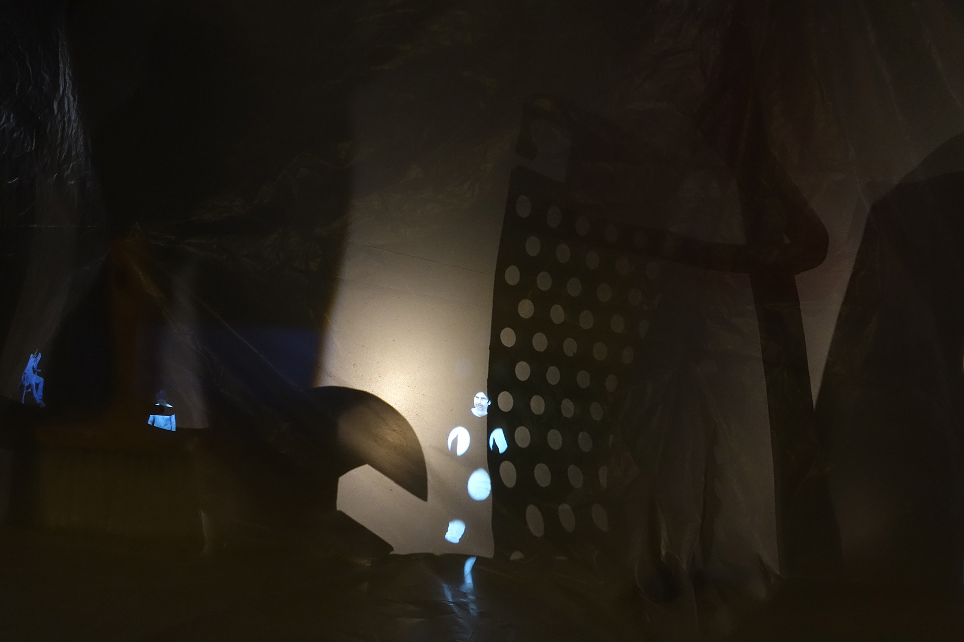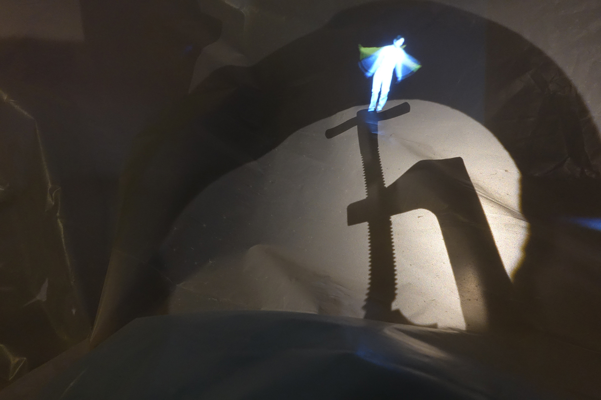 Un personnage s’anime, se démultiplie, sur une bâche et répète les même gestes liés au travail, à la recherche. Il explore le « faire » de l’image par rapport à l’existence réelle des objets, leurs ombres, et leur forme que l’on arrive parfois à discerner derrière la bâche. Très proche de la bâche, ils oscillent entre existence réelle et fruit de notre imagination.